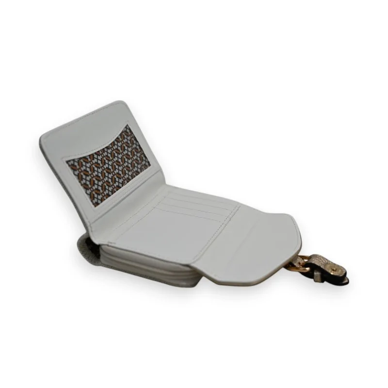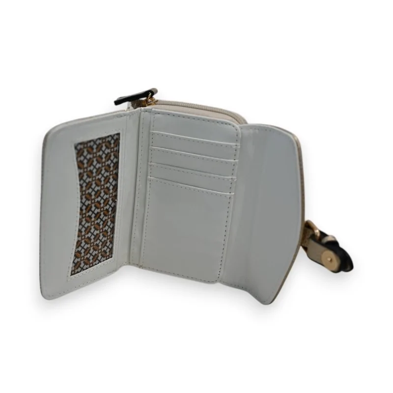 Esta refinada cartera de Mélanie Paris combina elegantemente una tela de lona beige con detalles en sintético dorado. Sus dimensiones compactas de 14 x 9 x 2,5 cm la convierten en el accesorio ideal para el uso diario. La parte delantera presenta una solapa brillante dorada con cierre magnético, complementada por una correa a juego para un estilo contemporáneo.