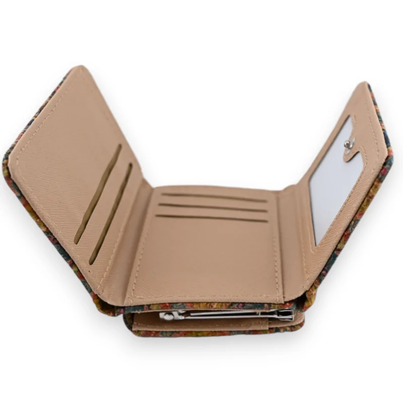 Si buscas una cartera a la vez elegante y práctica para la temporada de otoño, ¡no busques más! Esta pequeña cartera compacta de corcho cuenta con un diseño geométrico multicolor que no pasará desapercibido. Por dentro, ofrece un compartimento inteligente para tus tarjetas y billetes, asegurando una gestión impecable de tus finanzas. En la parte trasera, un portamonedas rígido en plata añade un toque de elegancia. Sus colores otoñales son perfectos para esta época del año, evocando las tonalidades cálidas de las hojas que caen. No dudes en añadir este joya a tu colección de accesorios. Dimensiones 11X9cm.
