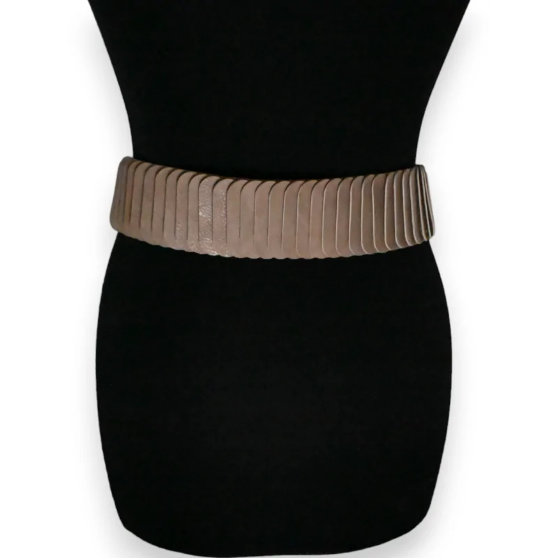 Descubre nuestro cinturón elástico de fantasía que combina un estilo moderno con una elegancia atemporal. En un profundo azul marino, se distingue por sus adornos dorados inspirados en una cadena de eslabones que le confieren un carácter único. Su distintiva hebilla dorada combina estética y practicidad gracias a su sistema de cierre con gancho. Extensible y con una longitud de 84 cm en reposo, se adapta perfectamente a tu morfología mientras aporta un toque sofisticado a tus atuendos.