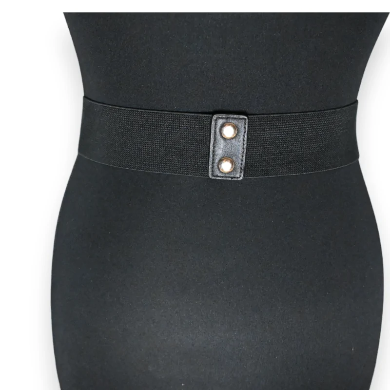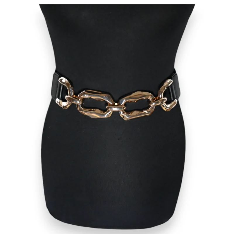 Aquí hay una descripción detallada de sus características distintivas: Diseño Audaz: El elemento que inmediatamente llama la atención es la gran cadena dorada colocada en el frente. A pesar de ser imponente, agrega un toque de audacia y originalidad al cinturón, haciéndolo instantáneamente reconocible. Aspecto Único: Gracias a esta cadena dorada, el cinturón se distingue claramente de otros accesorios. No es solo un medio para mantener un pantalón o una falda en su lugar; es una declaración de estilo por sí misma. Diseño Elástico: A pesar de que el cinturón tenga una presencia robusta con su cadena, sigue siendo cómodo gracias a su naturaleza elástica. Esto garantiza un ajuste perfecto al mismo tiempo que permite cierta flexibilidad. Cierre Práctico: La parte posterior del cinturón cuenta con un cierre de presión, garantizando así un soporte sólido al tiempo que ofrece la facilidad de poner y quitar el cinturón. Dimensiones y Tamaño: Sin estiramiento, el cinturón mide un total de 68 cm. Está diseñado para encajar cómodamente hasta una talla 42, lo que lo hace un accesorio adaptable para muchas mujeres.