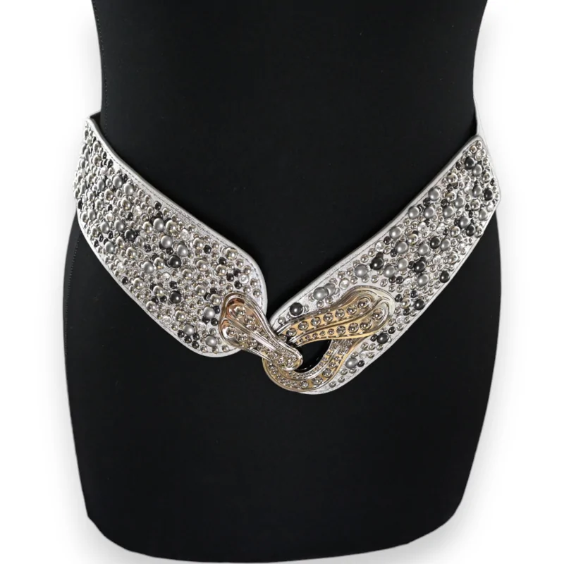 Eleva tu estilo con esta cinturón elástico para mujer, una fusión artística de tonos dorados y plateados. Cada sección de esta cinturón está adornada con lentejuelas brillantes, dispuestas en audaces y originales patrones geométricos. La pieza central es su hebilla plateada, en sí misma adornada con lentejuelas, que se combina con un gancho para ofrecer un cierre elegante. Esta cinturón no es solo un accesorio, es una declaración de estilo y elegancia. Su paleta de colores versátil se combina sin esfuerzo con cualquier atuendo, haciéndola tanto práctica como de moda. Midiendo 82 cm sin estiramiento, se adapta cómodamente a tallas hasta 42-44, garantizando un ajuste perfecto para muchas siluetas.