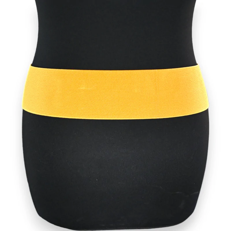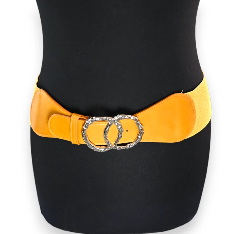 Descubre esta cinturón de fantasía elástico para mujer, un accesorio que combina audacia y elegancia. Hecho de cuero sintético combinado con un tejido de color mostaza, este cinturón es una verdadera declaración de estilo. Su hebilla plateada, que representa dos anillos entrelazados con habilidad, no solo es un punto focal elegante, sino también una garantía de practicidad. De hecho, gracias a esta hebilla y su gancho inteligentemente colocado en la parte delantera, se facilita la colocación del cinturón. Con una longitud total de 88 cm sin estiramiento, se adapta a diversas siluetas (hasta la talla 42) aportando un toque de color audaz y elegancia metálica a tu look.