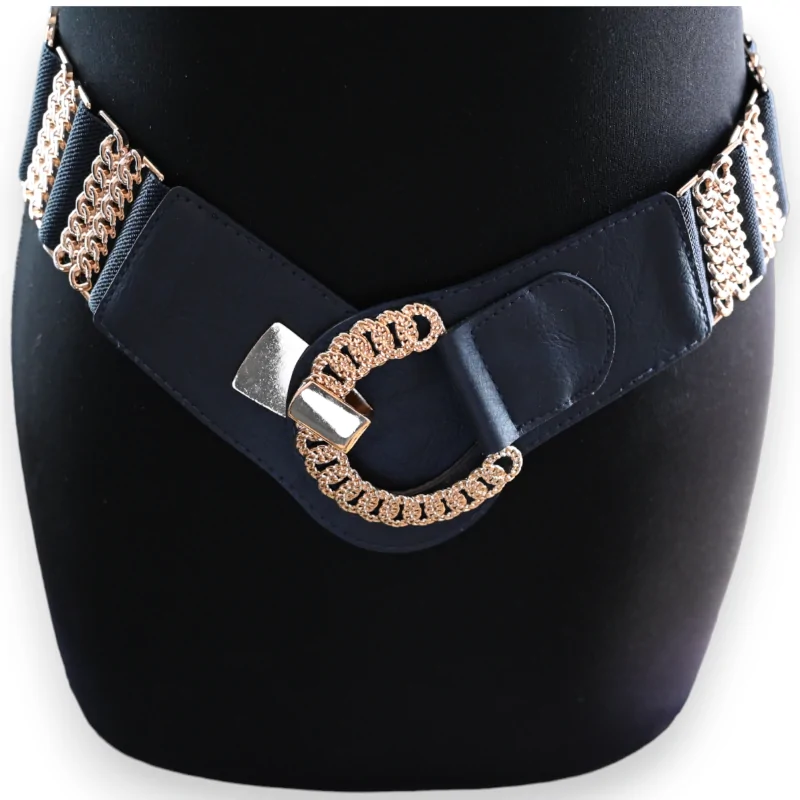 Descubre nuestro cinturón elástico de fantasía que combina un estilo moderno con una elegancia atemporal. En un profundo azul marino, se distingue por sus adornos dorados inspirados en una cadena de eslabones que le confieren un carácter único. Su distintiva hebilla dorada combina estética y practicidad gracias a su sistema de cierre con gancho. Extensible y con una longitud de 84 cm en reposo, se adapta perfectamente a tu morfología mientras aporta un toque sofisticado a tus atuendos.