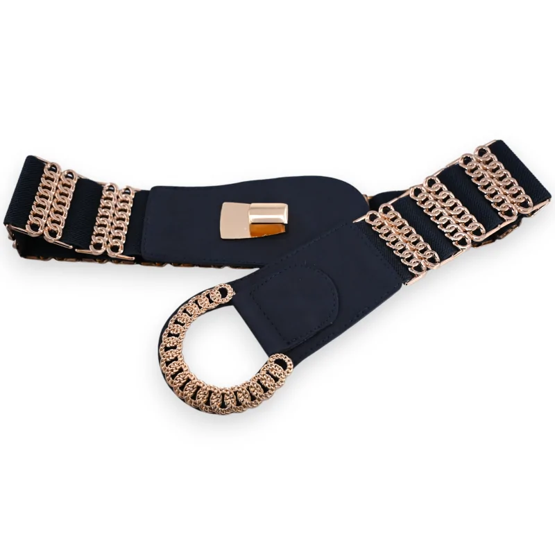 Este cinturón elástico de fantasía se distingue por su diseño contemporáneo que combina hábilmente el azul marino clásico con acentos dorados. Los adornos metálicos, dispuestos en filas armoniosas, crean un sofisticado efecto de cadena que capta delicadamente la luz. La hebilla dorada, verdadera pieza central del accesorio, presenta un acabado cuidadoso y un ingenioso mecanismo de cierre que garantiza un ajuste óptimo durante todo el día.