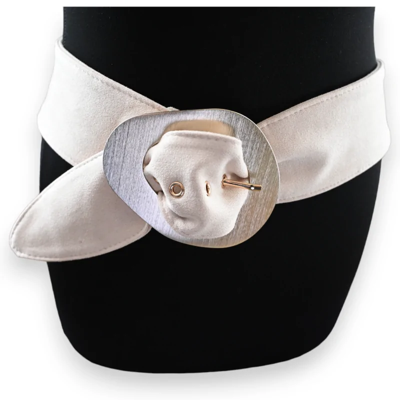 Eleva tu guardarropa con esta cinturón de fantasía para mujer. Hecho de tela de gamuza, seduce con su suavidad al tacto y su color beige atemporal. Su hebilla, de metal pulido dorado, añade un toque de sofisticación discreta. Con una longitud total de 117 cm, está adaptada para tallas hasta 42-44, combinando comodidad y elegancia.