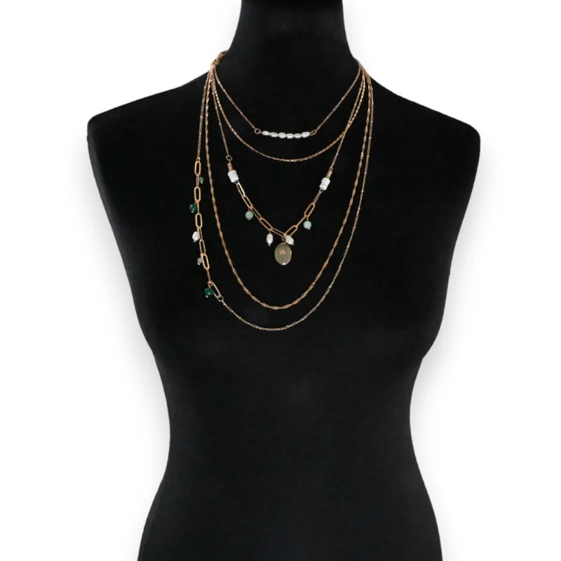 Ofrézcate un toque de elegancia refinada con este collar de fantasía teñido de oro. Compuesto por cinco filas finas, seduce por la diversidad de sus mallas, cada segmento está delicadamente salpicado de perlas de tonos verdes y blancos. Su pieza maestra es una breloque central, sublimada por una piedra verde de agua y coronada por una estrella, evocando un encanto puro y delicado. Con sus 37.50 cm de longitud y su cadena ajustable, este collar se adapta suavemente a tu estilo y a tu morfología.