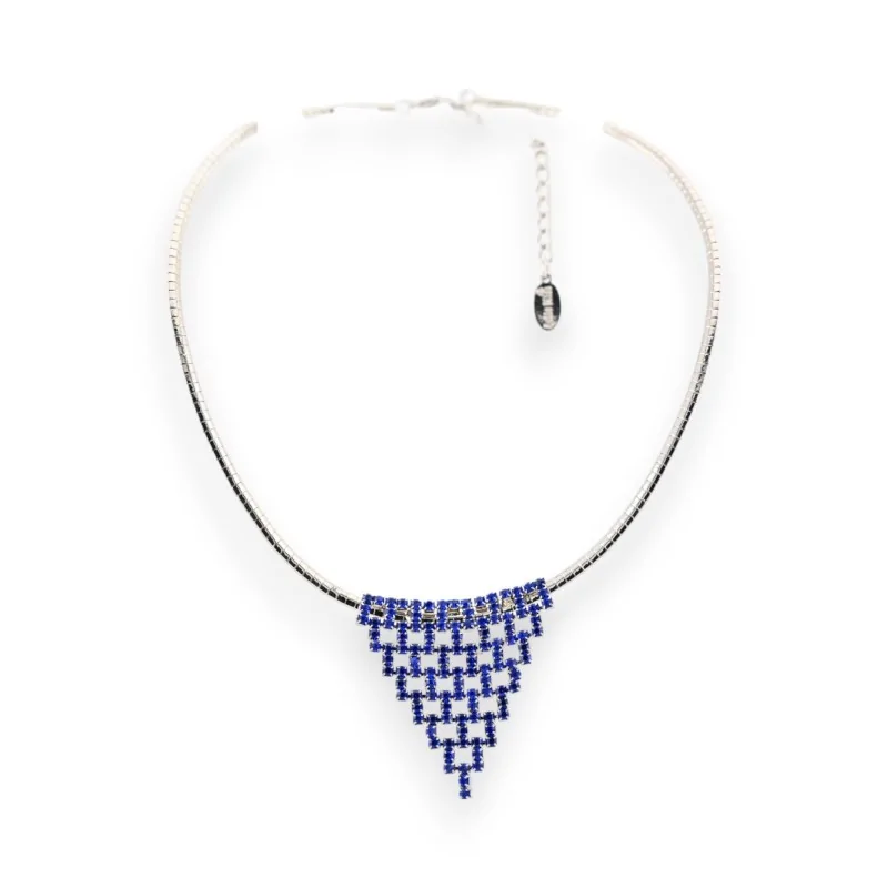Este collar gargantilla plateado es el accesorio ideal para realzar tus atuendos. Su diseño depurado y contemporáneo lo convierte en una joya versátil, perfecta para todas las ocasiones. La gargantilla rígida ofrece un ajuste óptimo y realza tu escote con elegancia. El punto fuerte de este collar reside en su colgante triangular con incrustaciones de estrás azul rey, que atrae sutilmente la mirada y aporta un toque de color sofisticado a tu look.