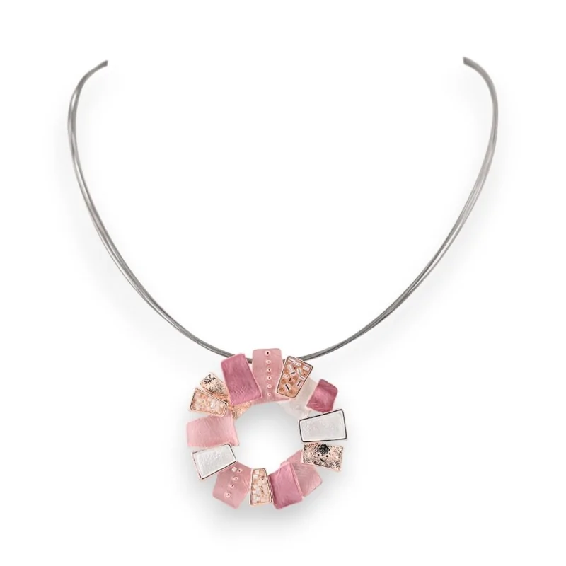 Este collar Ikita se distingue por su colgante circular de diseño decididamente contemporáneo. Compuesto por un mosaico de elementos geométricos, combina armoniosamente tonos rosados y toques dorados. Esta combinación de colores suaves y luminosos aporta una nota de feminidad y sofisticación. La forma circular evoca equilibrio e infinito, confiriendo una dimensión simbólica a esta joya. Con sus líneas depuradas y su estética cuidada, este collar se inscribe perfectamente en las tendencias actuales manteniendo un carácter atemporal.