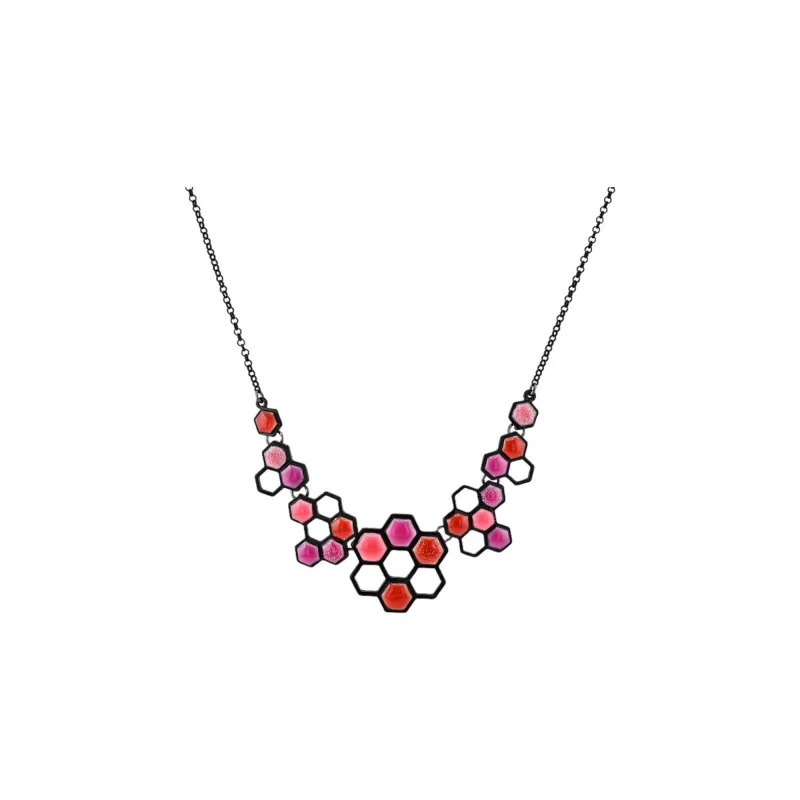 Lo que hace que este collar sea realmente único es el degradado de colores que adorna ciertos alvéolos. Tonos suaves de rosa y naranja iluminan la estructura negra, creando un contraste impactante. Estos matices cálidos y femeninos aportan un toque de color sutil que atrae la mirada sin ser demasiado llamativo. La combinación de negro y tonos rosados confiere a esta joya de fantasía una elegancia atemporal que se adapta a numerosas ocasiones.