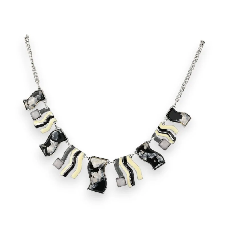 Déjese seducir por la elegancia y originalidad de este collar de fantasía con diseño escamado. Su motivo en blanco roto y negro aporta un toque de sofisticación a cualquier atuendo. El acabado cuidadoso y los detalles sutiles lo convierten en un accesorio de moda imprescindible para las mujeres que les gusta destacar con estilo. Este collar es la combinación perfecta entre refinamiento y modernidad, ideal para realzar tanto un atuendo de día como un vestido de noche.