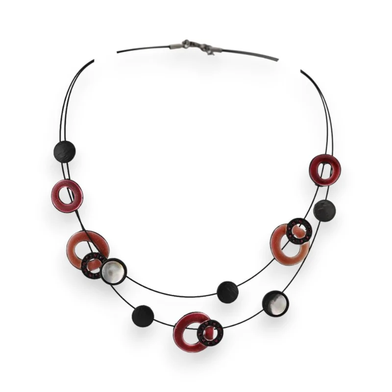 El collar de fantasía de doble hilera Ikita seduce por su diseño depurado y sofisticado. Montado sobre un fino cable negro que le confiere ligereza y flexibilidad, esta joya se compone de dos hileras asimétricas adornadas con perlas y anillos en tonos cálidos. Los matices marrones y burdeos armonizan con elegancia, creando un contraste sutil con el negro del cable. Esta combinación de colores permite que el collar se adapte fácilmente a diferentes estilos de vestir, desde el más casual hasta el más elegante.