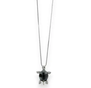 Descubre este magnífico collar de fantasía con tortuga en tonalidad plateada, símbolo atemporal de sabiduría y longevidad. Su colgante de 6cm luce una piedra brillante con efecto espejo gris que refleja sutilmente la luz, mientras que la cabeza y extremidades están adornadas con strass blancos resplandecientes. La cadena de 40,5cm incluye una extensión para un ajuste perfecto según tus gustos y morfología.