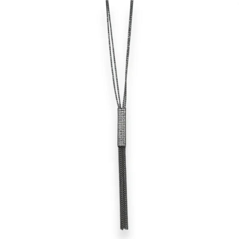Elegancia y modernidad se encuentran en este collar de fantasía con tono gris metalizado. En el corazón de esta joya, un medallón de forma rectangular capta la atención, maravillosamente adornado con brillantes estrás blancos que reflejan la luz con cada movimiento. Cada estrás fue cuidadosamente seleccionado para ofrecer un brillo sin igual al medallón, creando un contraste impresionante con el fondo gris. Pero lo que hace que este collar sea aún más único son sus franjas metalizadas diseñadas en forma de pequeñas bolas. Añaden un toque de originalidad y movimiento, alargando delicadamente el medallón hasta una longitud total de 17,5 cm. El collar se extiende sobre una cadena sólida y refinada de 57 cm, que cae perfectamente alrededor del cuello, resaltando el escote. Para asegurarse de que se adapte a cada portador, una cadenita de ajuste se agrega sabiamente, permitiendo ajustar el collar a la longitud deseada.