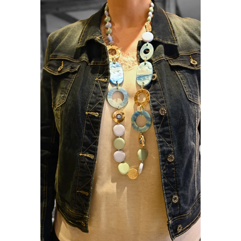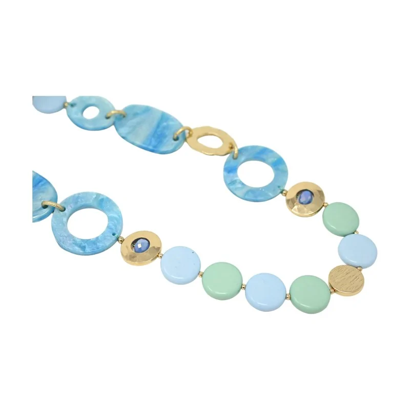 Esta joya excepcional, un collar vintage, se presenta en forma de una secuencia armoniosa de círculos de diferentes tamaños, bañados en una paleta de azul, con sutiles incrustaciones doradas para un efecto brillante. La resina, material de elección para este collar, asegura una ligereza incomparable, convirtiéndolo en el accesorio ideal para elevar cualquier look de temporada. Con una longitud de 54cm, envuelve al portador con un aura de sofisticación.