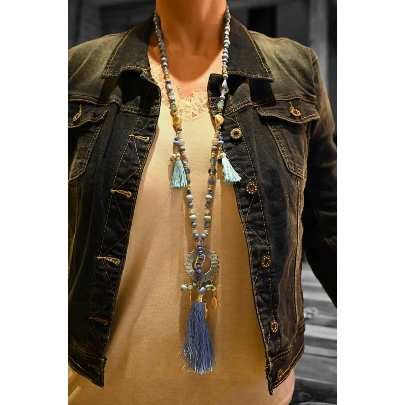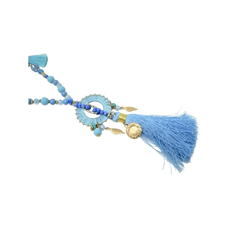 Sumérgete en el azul con este collar de 64 cm, un homenaje a la libertad bohemia teñido de azul. Esta joya única está salpicada de perlas y piedras de formas y tamaños variados, evocando la diversidad y la belleza del mundo bohemio. A cada lado del collar, hay encantos de borlas azules, dispuestos asimétricamente, bailan al ritmo de tus movimientos, añadiendo un toque de fantasía y movimiento. En el centro de esta creación, un medallón redondo, calado y tejido con hilos azules, está acompañado de una elegante borla azul, capturando la esencia del verano y del cielo infinito. Este collar, con su tema bohemio y su color ideal para la bella estación, es el accesorio perfecto para las almas libres y creativas, deseosas de agregar una nota de color y originalidad a su guardarropa.