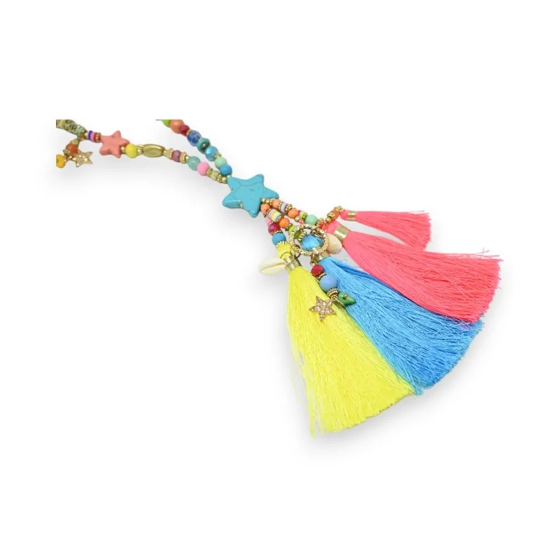 Sumérgete en un festival de colores brillantes con este collar de fantasía de 62 cm, un verdadero fuego de artificio visual para un verano inolvidable. Sus tonos multicolores y llamativos, adornados con perlas magníficamente combinadas, capturan el espíritu de la alegría y la celebración. Los colgantes de pompones en rosa brillante, acompañados de estrellas doradas y charms en forma de letras que forman la palabra "amor", añaden un toque de romanticismo audaz. En el centro, un medallón estrella en turquesa vibrante atrae inmediatamente la mirada, rodeado de pompones en colores vivificantes de rosa neón, amarillo neón y azul. Colgantes adicionales en tonos alegres completan esta obra maestra, prometiendo hacer de cada día de verano una celebración brillante de la vida.