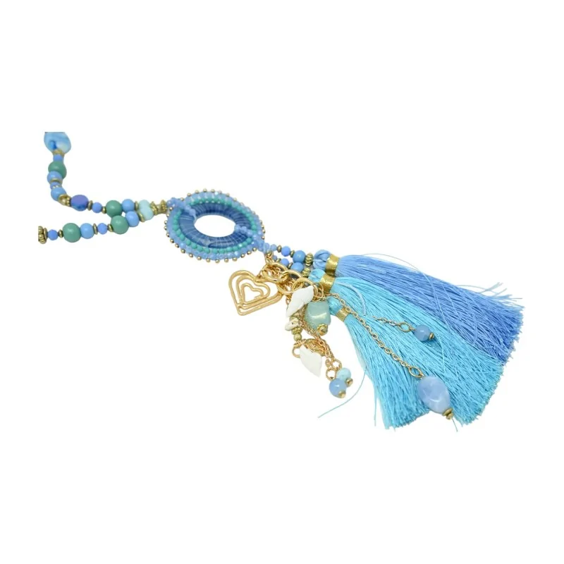 Este collar tipo sautoir de 65 cm, inspirado en la serenidad y profundidad de los océanos, juega con toda la gama de azules para evocar la tranquilidad de las aguas. Las perlas y piedras fantasía, seleccionadas por su brillo y tono azul, recuerdan los cambiantes matices del mar, desde los azules claros de las lagunas tropicales hasta los profundos índigos de las profundidades abisales. El medallón central, un círculo delicadamente calado y rodeado de perlas, es una ventana al mundo submarino, rodeado de pompones que evocan el baile de las olas. Los dijes en forma de corazón, las piedras seleccionadas, las conchas y las cadenas doradas añaden toques de luz y brillo, como tesoros descubiertos en la arena. Esta joya es una invitación a llevar la paz y la belleza del océano, añadiendo un toque de elegancia refrescante a tu guardarropa.