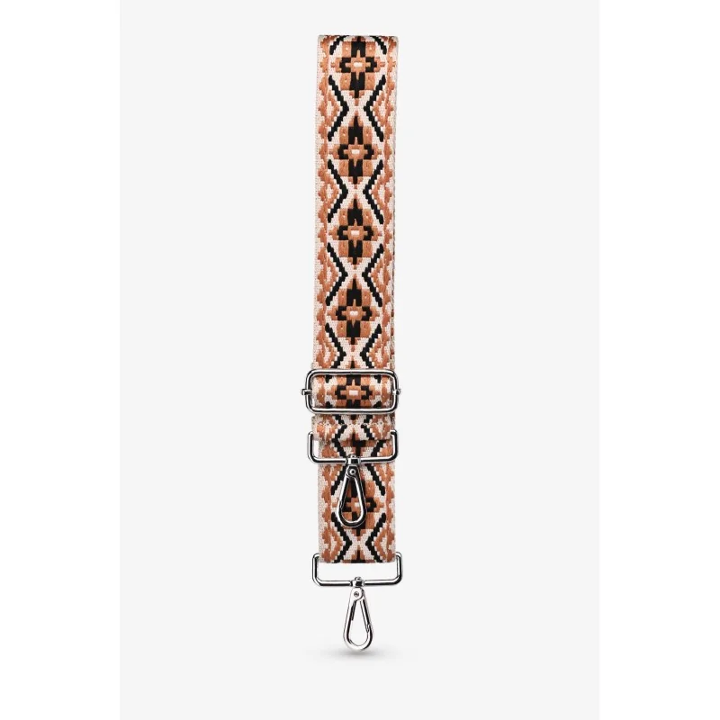 Añade un toque de originalidad a tu atuendo con nuestra correa étnica de tela estampada. Su motivo geométrico en camel y negro aporta un estilo bohemio chic a tus bolsos y accesorios. Práctica y cómoda gracias a sus 5 cm de ancho y su longitud ajustable de 60 a 120 cm, se adapta a todas las morfologías. El mosquetón plateado permite una fijación fácil y segura. Un accesorio de moda indispensable para un look trendy en el día a día.