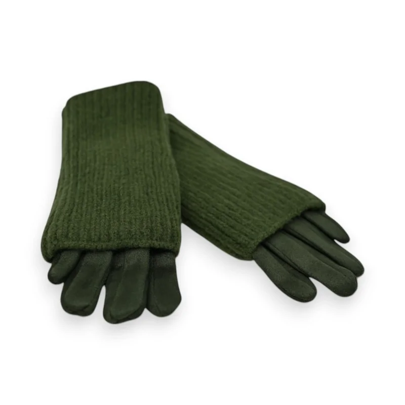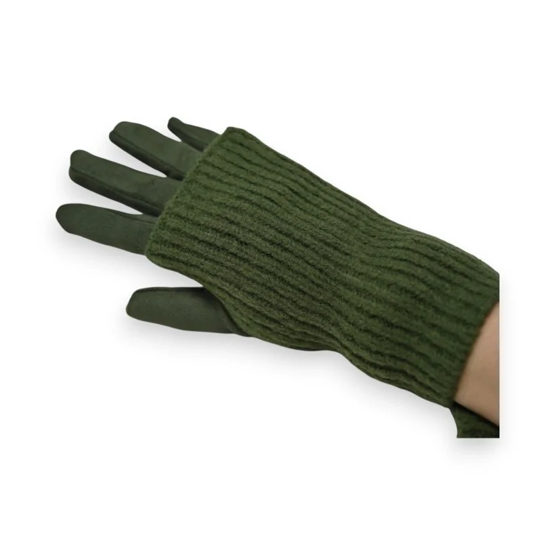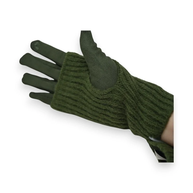 Estos guantes mitones 2 en 1 color caqui combinan estilo y funcionalidad para el invierno. La parte de los guantes de ante ultrasuave ofrece calidez y comodidad gracias a su forro de terciopelo. La parte de los mitones de punto acrílico permite liberar los dedos si es necesario. Úselos juntos o por separado según sus preferencias. Su diseño versátil y su color caqui de moda los convierten en un accesorio indispensable para enfrentar el frío con elegancia.