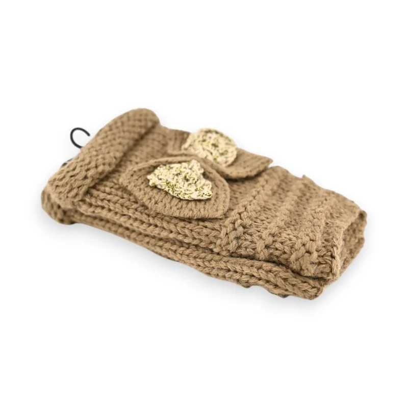 Añade un toque de elegancia a tu atuendo invernal con estos encantadores mitones tejidos. Confeccionados en un suave tono topo, lucen un bonito lazo en relieve con detalles dorados que aporta una nota refinada. Su forro cálido y su talla única garantizan un confort óptimo para todas las manos. ¡Perfectos para enfrentar los días frescos con estilo!