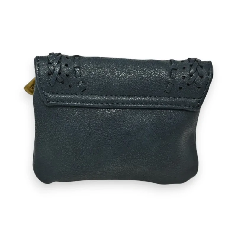 Esta cartera Mandoline de material sintético azul marino es a la vez elegante y funcional. Su solapa decorada con un motivo trenzado añade un toque de fantasía, mientras que el cierre magnético asegura un cierre seguro. Compacta con sus dimensiones de 14x12cm, cuenta con un bolsillo con cremallera para guardar sus efectos personales de forma segura. Un accesorio de moda indispensable para organizar sus esenciales diarios.