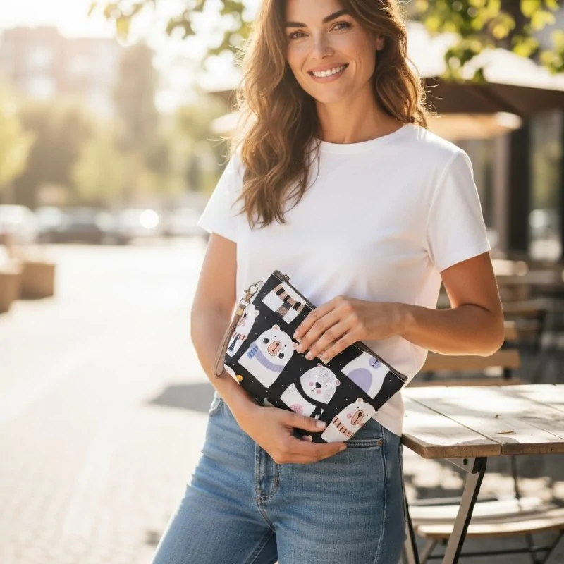 Este encantador neceser tendencia seduce por su motivo de adorables osos sobre fondo negro estrellado, creando un dise?o a la vez moderno y entra?able. Dise?ado espec?ficamente para mujeres j?venes que buscan un accesorio tanto pr?ctico como est?tico, este neceser combina funcionalidad ?ptima y estilo ?nico. El tejido de poli?ster impermeabilizado garantiza una protecci?n eficaz contra la humedad mientras conserva su belleza original. Sus generosas dimensiones de 22 x 13,5 x 6,5 cm ofrecen un espacio de almacenamiento ideal para todos tus productos de belleza esenciales, desde brochas hasta paletas pasando por pintalabios. El cierre con cremallera asegura una seguridad perfecta de tus preciosos cosm?ticos durante tus desplazamientos.