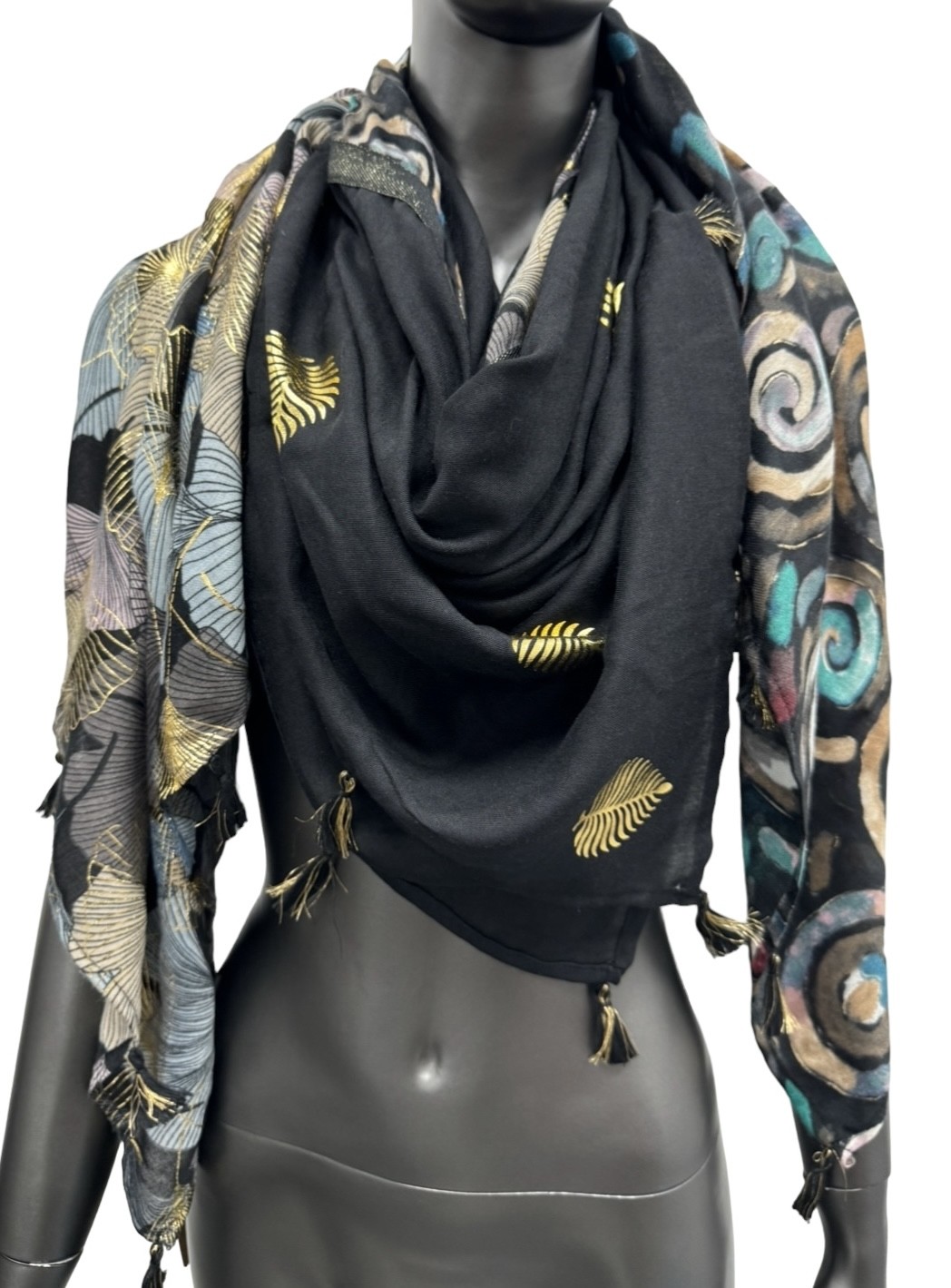 Pañuelo Cuadrado negro Patchwork Ginkgo y Círculos