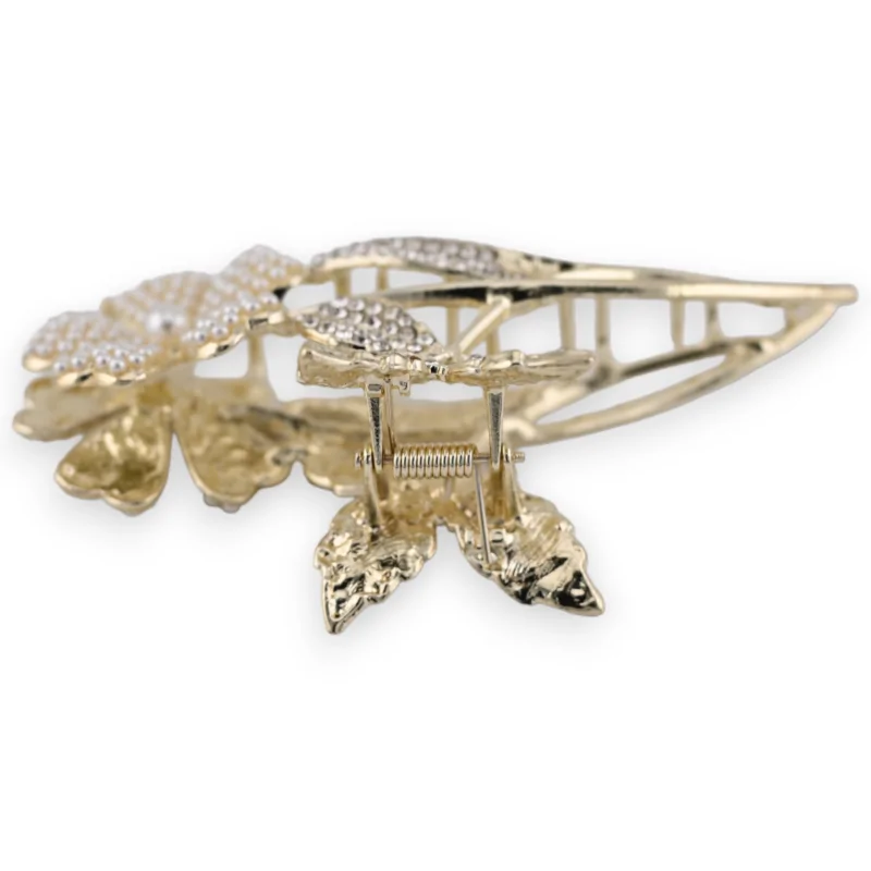 Pinza de pelo dorada flor sobre su tallo de perla y strass