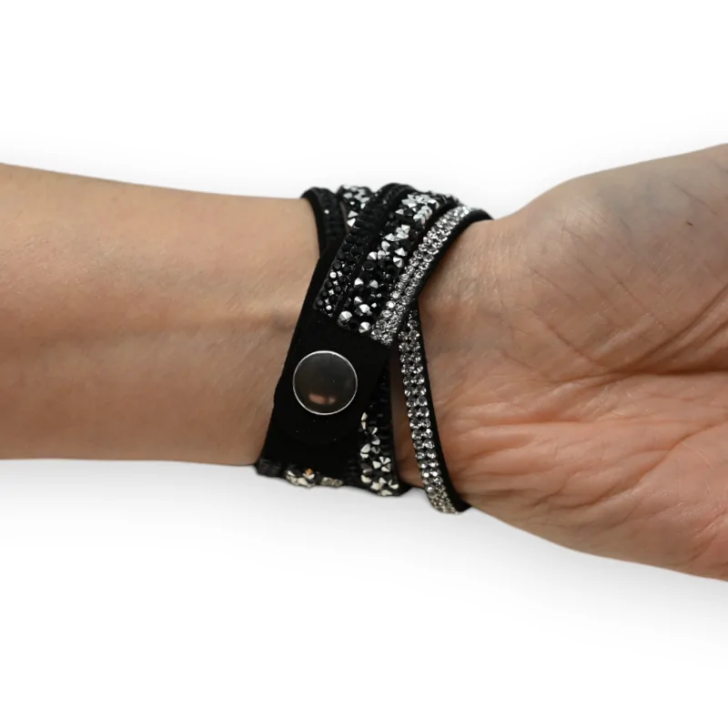 Sublime su muñeca con esta pulsera de doble vuelta en cuero sintético de tono negro, que mide 39 cm de longitud. Esta pieza única se distingue por su conjunto de diferentes pulseras: una adornada con tachuelas para un look audaz, otra brillante con strass para un brillo chic, y finalmente, una pulsera trenzada que añade un toque de autenticidad y textura. La comodidad no se queda atrás, gracias a un sistema de cierre magnetizado que permite una colocación rápida y segura. Esta pulsera es una verdadera pieza de colección, perfecta para complementar una variedad de atuendos, desde los más casuales hasta los más sofisticados, con una facilidad desconcertante.