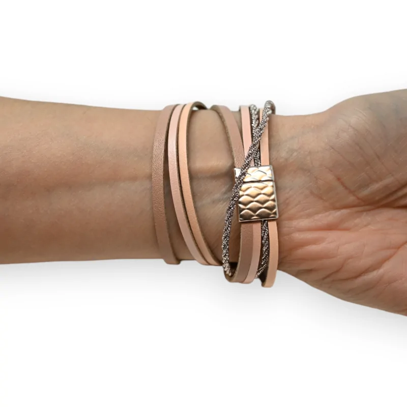 Esta delicada pulsera de doble vuelta, hecha de auténtico cuero en un suave rosa pastel, encarna la quintaesencia de la feminidad y la delicadeza. En el corazón de esta creación, una encantadora estrella delicadamente trabajada alberga perlas rosas finamente pegadas, aportando un toque de gracia y originalidad. Con una longitud de 38 cm, esta joya es la perfecta expresión de una tendencia que combina sutilmente el clasicismo y la modernidad. Su diseño único y su color suave la convierten en un accesorio imprescindible para aquellas que buscan añadir un toque de dulzura y elegancia a su armario. Sistema magnético para el cierre de la pulsera, fácil de poner.