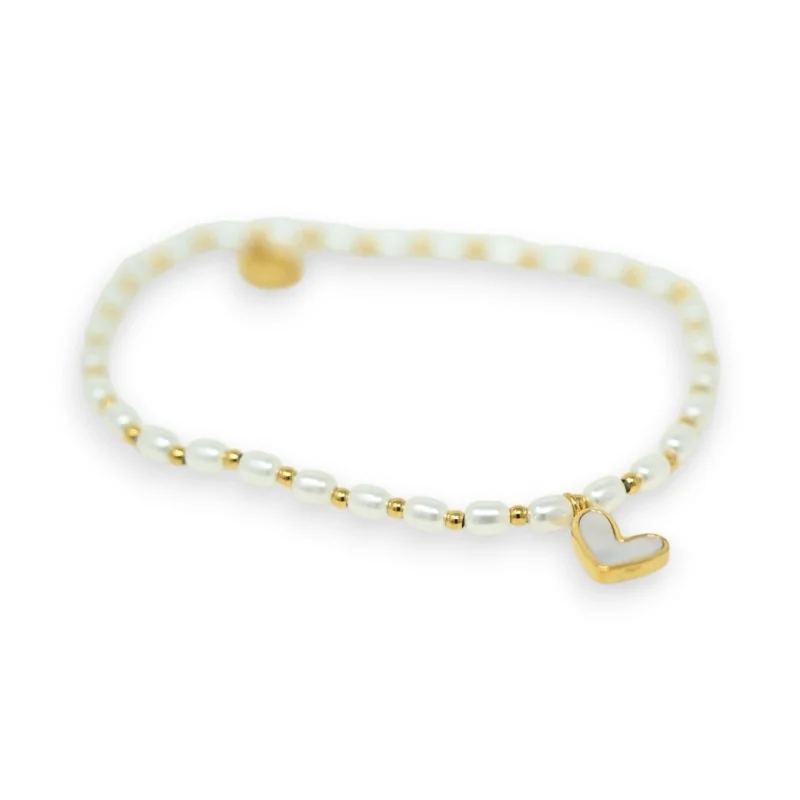 Lo que verdaderamente distingue a esta pulsera es su encantador colgante en forma de corazón. Este pequeño detalle añade un toque de romanticismo y dulzura al conjunto. El corazón, también en tonos blanco y dorado, armoniza perfectamente con las perlas de la pulsera. Aporta una dimensión simbólica a la joya, convirtiéndola en un regalo ideal para expresar sentimientos o simplemente para darse un capricho.
