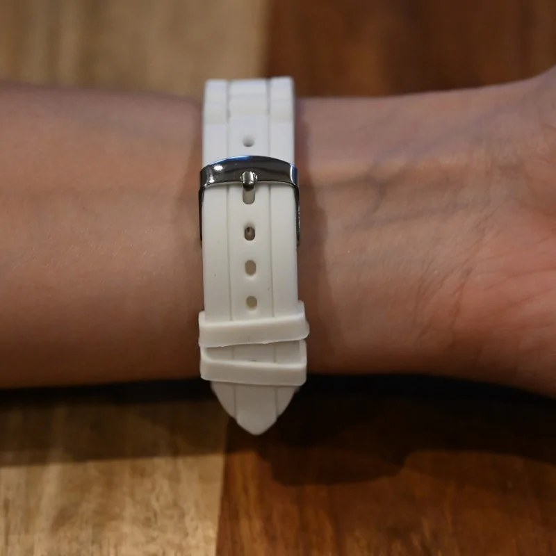 Muestra tu sentido del estilo con el reloj "Ernest". Su robusta correa de silicona blanca complementa perfectamente el dial lleno de detalles, adornado con brillantes lentejuelas, todo en un fondo de pantalla con un brillante gris. Un reloj que define la elegancia moderna.