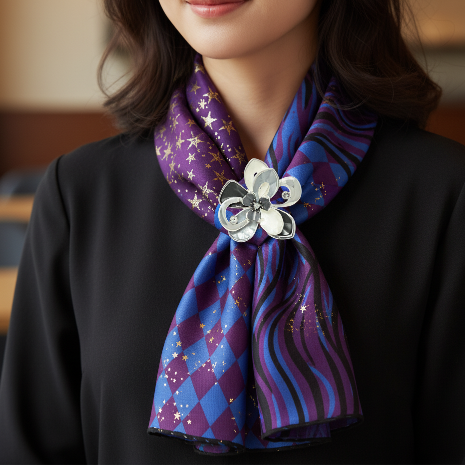 Les broches magnétiques excellent également pour maintenir un foulard ou une écharpe en place. Fini les nœuds complexes ou les écharpes qui se défont : placez simplement votre foulard comme vous le souhaitez et fixez-le avec une broche aimantée pour un maintien impeccable toute la journée. Cette technique fonctionne particulièrement bien avec les foulards en soie ou les écharpes légères qui glissent facilement.