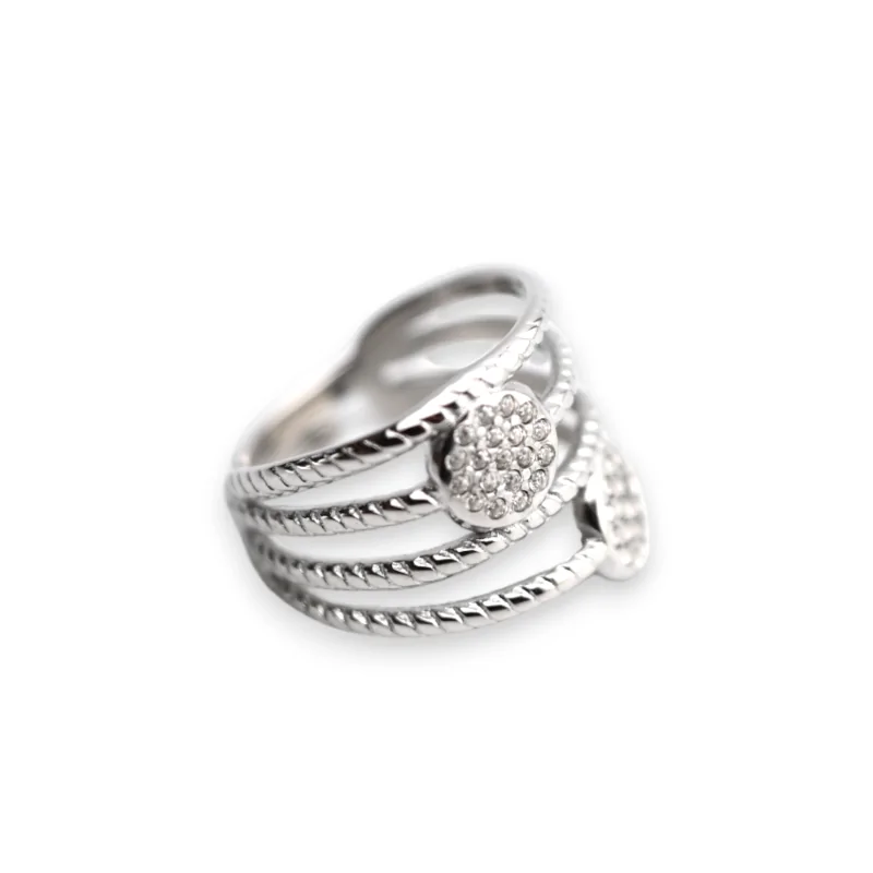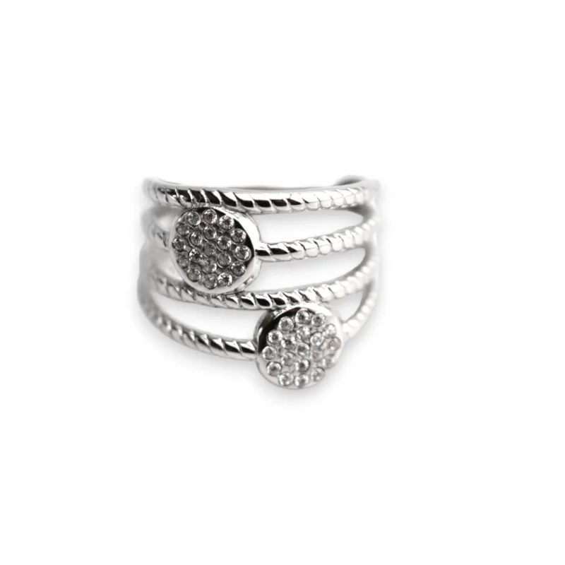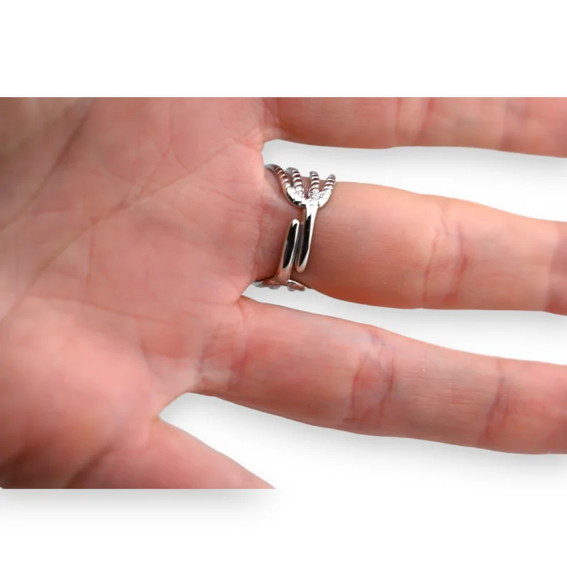 Conçue en acier inoxydable fini en une teinte argentée lumineuse, cette bague est un véritable chef-d'œuvre de la joaillerie. Elle se caractérise par quatre niveaux d'anneaux soigneusement martelés, donnant un aspect à la fois rustique et moderne. Cette texture martelée est magnifiquement contrastée par la présence de deux petites incrustations rondes de strass, apportant une touche scintillante de raffinement. La délicatesse de sa conception est amplifiée par son élégance innée, rendant la bague adaptée à toute occasion. En outre, grâce à son mécanisme de réglage astucieux, elle épouse parfaitement tous les doigts, alliant beauté et confort.