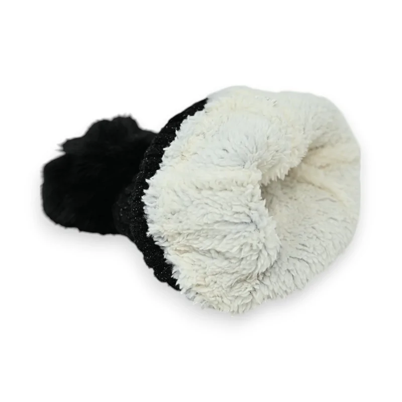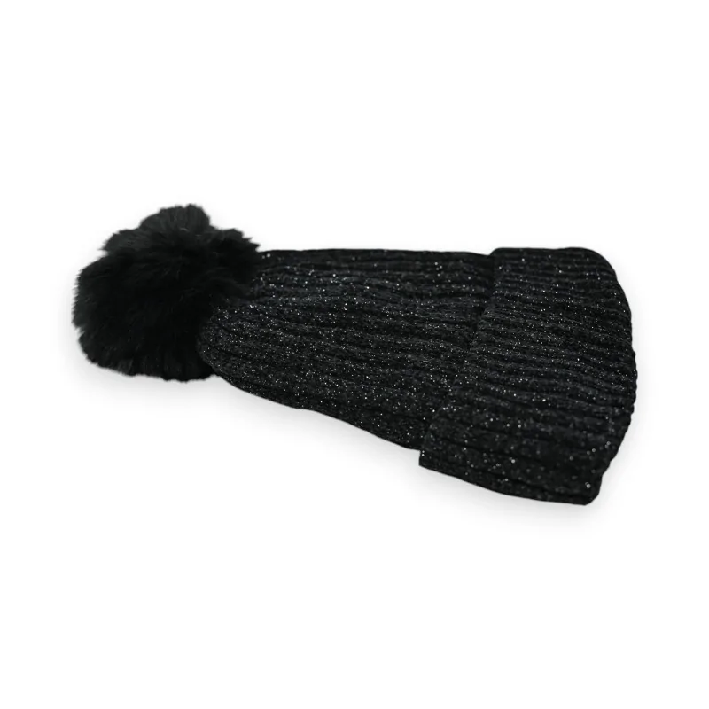 Ce bonnet en velours côtelé se distingue par son design raffiné et ses finitions soignées. La texture côtelée du velours, rehaussée de subtils reflets argentés, apporte une dimension premium à l'accessoire. La couleur noire, indémodable, s'harmonise facilement avec toutes les tenues d'hiver. Le pompon synthétique, particulièrement moelleux, couronne l'ensemble d'une touche ludique et tendance.
