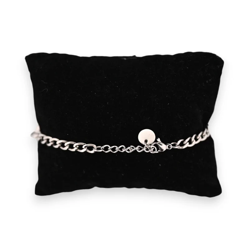 Ce bracelet en acier argenté présente un design délicat et sophistiqué, parfait pour ajouter une touche d'élégance discrète à toute tenue. Au cœur de cette pièce se trouvent trois petits cercles, chacun méticuleusement incrusté de strass lumineux, dispersés le long de la chaîne avec une harmonie visuelle exquise. Ces ornements en strass captent la lumière à chaque mouvement, offrant un scintillement subtil mais captivant. La chaîne, d'une dimension généreuse de 21 cm, assure un ajustement confortable et versatile, permettant à ce bracelet de s'adapter à une variété de tailles de poignet avec élégance. Cet accessoire, à la fois tendance et intemporel, est conçu pour ceux qui recherchent à allier finesse et sophistication dans leur expression personnelle de style.