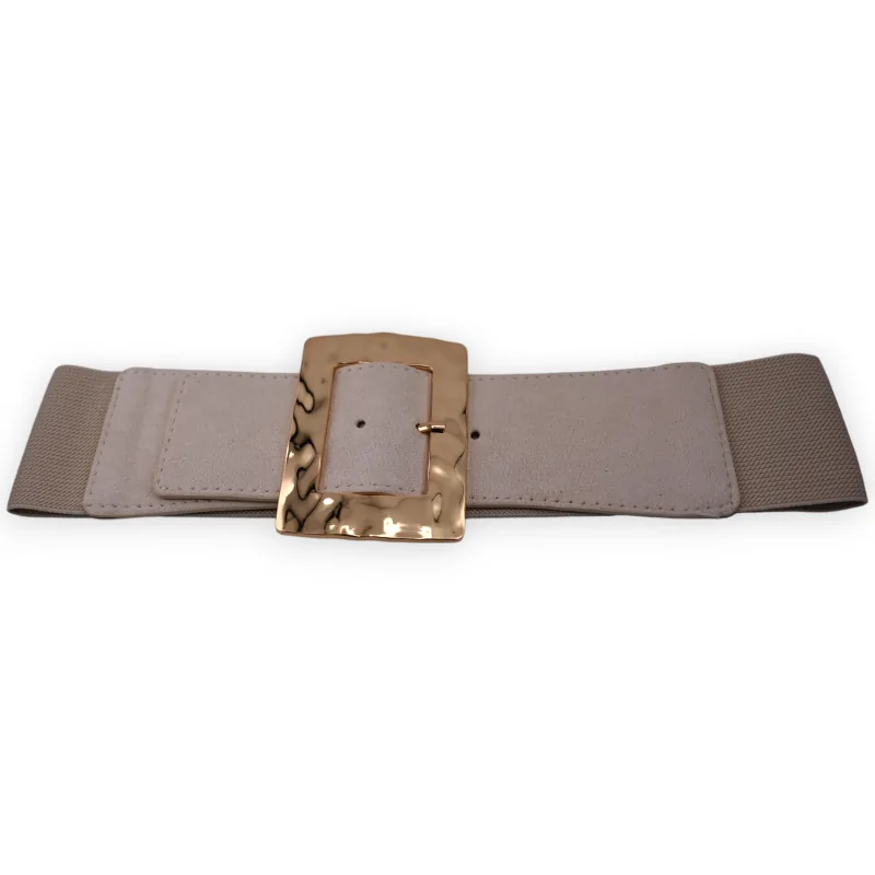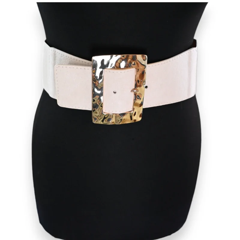 Découvrez la quintessence du style avec cette ceinture fantaisie élastique pour femme. Mêlant astucieusement le simili cuir à un tissu beige délicat, elle évoque à la fois raffinement et modernité. Sa boucle dorée, imposante avec ses 11 cm, s'affirme comme le joyau central de cette ceinture, lui conférant une allure à la fois audacieuse et sophistiquée. Mesurant 83 cm sans étirement, elle est conçue pour s'adapter harmonieusement à votre silhouette. De plus, la boucle ne sert pas uniquement d'ornement, elle facilite également la fermeture de la ceinture.