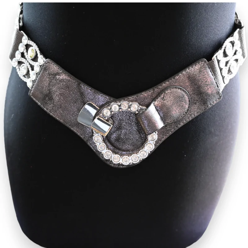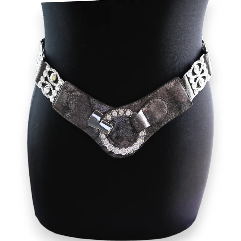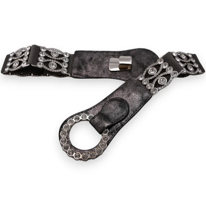 Alliant l'élégance intemporelle à un design moderne, cette ceinture fantaisie élastique pour femme est un véritable trésor d'accessoire. Confectionnée en simili cuir gris, elle dévoile un effet patiné argenté, offrant un charme vintage. La pièce maîtresse, une boucle étincelante, est magnifiquement embelli de strass, tout comme le contour de la ceinture, qui se voit orné de strass et de pierres blanches brillantes, ajoutant une note de sophistication. Mesurant 83 cm sans étirement, elle épouse parfaitement les tailles allant jusqu'au 42-44. Et pour la praticité ? Sa boucle élégante fait également office de fermeture.