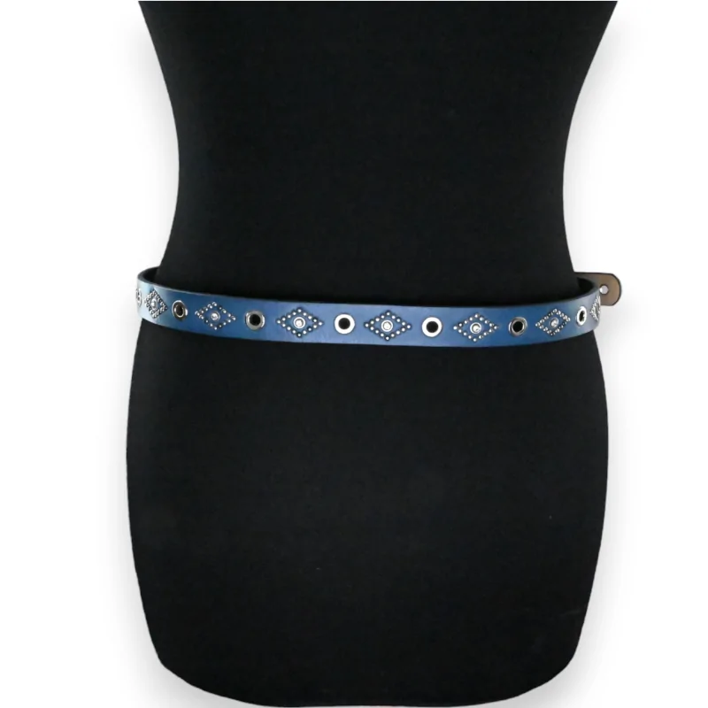 Sublimez votre tenue décontractée avec cette ceinture pour femme, de couleur bleu jeans, minutieusement confectionnée en croûte de cuir de vachette. Elle affiche un design distinctif grâce à ses clous argentés en forme de losange, mettant en avant une géométrie élégante. Chaque clou est embellit d'un strass soigneusement inscrusté, apportant une étincelle subtile à la pièce. Sa boucle, au charme intemporel, présente un effet vieilli argenté qui complète parfaitement le design. Associée à un jean, cette ceinture devient l'accessoire idéal pour rehausser un look casual.