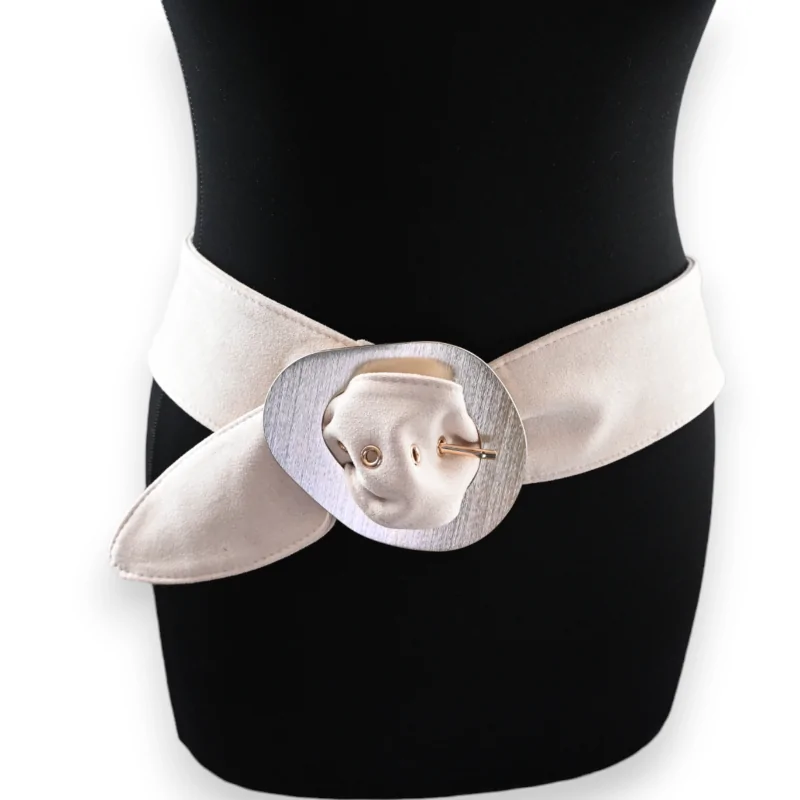 Élevez votre garde-robe avec cette ceinture fantaisie pour femme. Fabriquée en tissu suédine, elle séduit par sa douceur au toucher et sa couleur beige intemporelle. Sa boucle, en métal brossé doré, ajoute une touche de sophistication discrète. Avec une longueur totale de 117 cm, elle est adaptée pour des tailles jusqu'à 42-44, combinant confort et élégance.