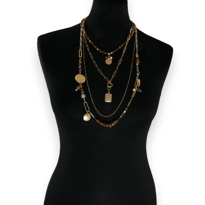 Évadez-vous vers des contrées lointaines avec ce collier fantaisie teinté de dorures lumineuses. Il se compose de quatre rangées élaborées avec soin, chaque segment révélant un design de maille singulier. Certaines de ces mailles sont magnifiées par des pierres aux nuances marron, évoquant la richesse et la chaleur des terres orientales. Les breloques délicatement intégrées à quelques-unes des chaînes renforcent cette impression d'évasion, plongeant celui ou celle qui le porte dans une ambiance orientale grâce à ses couleurs chaudes et envoutantes. D'une dimension de 38 cm, ce bijou est une véritable invitation au voyage, apportant une touche d'exotisme à votre parure.