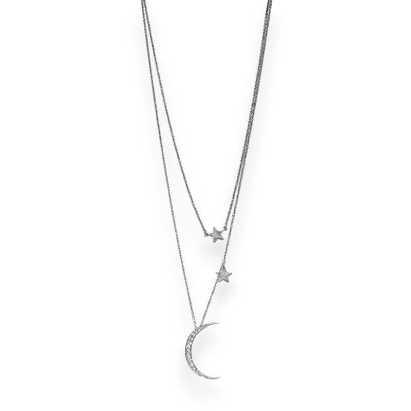 Découvrez un bijou exceptionnel qui évoque la magie du ciel étoilé avec ce collier fantaisie argenté à double rangée. La première rangée met en avant une étoile délicatement dessinée, éclatante et symbolisant l'espoir. Sur la seconde rangée, une lune en strass scintille majestueusement, accompagnée de sa compagne, une petite étoile, comme pour recréer une portion du firmament autour de votre cou. Le médaillon représentant la lune mesure 2,5 cm, et le collier, dans son ensemble, s'étend sur une longueur de 25 cm.