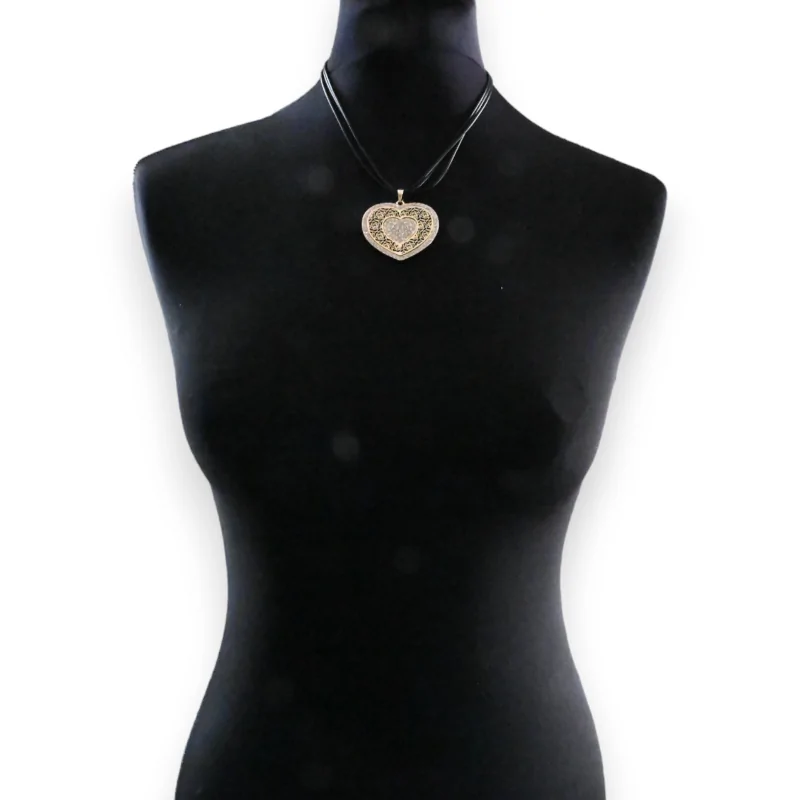 écouvrez ce collier fantaisie, une véritable ode à la féminité. Au centre, trône un cœur doré minutieusement travaillé avec un effet dentelle, évoquant délicatesse et raffinement. Ce design aérien est rehaussé par un contour étincelant de strass, ajoutant une touche de glamour à l'ensemble. Mais ce n'est pas tout : au cœur de ce bijou se niche un autre cœur, entièrement conçu en strass brillants, qui capte la lumière à chaque mouvement. Avec un médaillon mesurant 3,7 cm et une longueur totale de 25,5 cm, ce collier est ajustable grâce à sa chaînette, assurant ainsi un port adapté à chaque envie. Cette pièce est une alliance parfaite entre élégance intemporelle et brillance moderne, prête à compléter chaque tenue avec distinction.