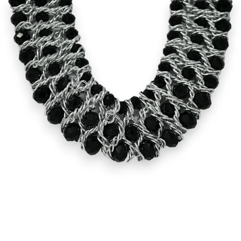 Plongez dans un univers d'élégance avec ce collier fantaisie ras de cou, conçu pour les amatrices de finesse. Il est subtilement orné de pierres noires qui contrastent avec des détails argentés, créant une harmonie visuelle aussi chic que captivante. Cette pièce, à la fois habillée et raffinée, se porte aisément en toute occasion, apportant une touche distinguée à votre tenue. Et pour une allure complète, ce collier est accompagné de ses boucles d'oreilles assorties. Elles reprennent le thème des pierres noires, mais dans une version discrète, offrant une élégance sous-jacente sans être trop ostentatoires. Le collier mesure au total 19 cm, mais pour s'adapter à toutes les préférences et morphologies, il est pourvu d'une chaînette ajustable.