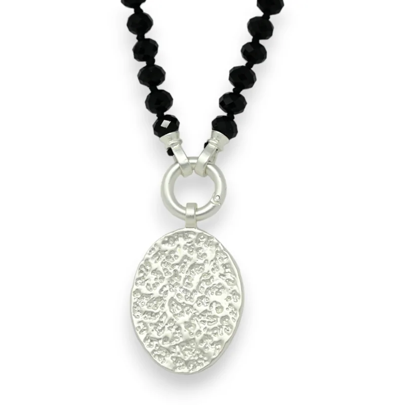 Sublimez votre tenue avec ce collier fantaisie, qui combine l'élégance intemporelle de perles noires brillantes avec un médaillon en argent brossé. Ce dernier, situé stratégiquement à l'avant, sert de fermoir et ajoute une touche moderne à l'ensemble. Facile à mettre et à enlever, ce système de fermeture novateur assure que le médaillon reste bien en place, tout en mettant en valeur votre décolleté. D'une longueur de 50 cm, ce collier épouse parfaitement la courbe de votre cou, créant un look à la fois sophistiqué et pratique pour toutes les occasions.