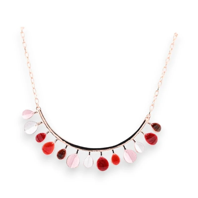 Le collier semi-rigide Ikita se distingue par son design à la fois moderne et élégant. Sa structure en métal cuivré rosé offre une base solide et brillante qui met en valeur les délicats pendentifs. Les gouttes suspendues au collier présentent une palette de couleurs allant du transparent au rouge profond, en passant par des nuances de rose pâle. Cette variété chromatique permet au bijou de s'adapter à différents styles vestimentaires et occasions. La forme semi-rigide du collier assure un maintien parfait autour du cou, tout en offrant un confort optimal lors du port.