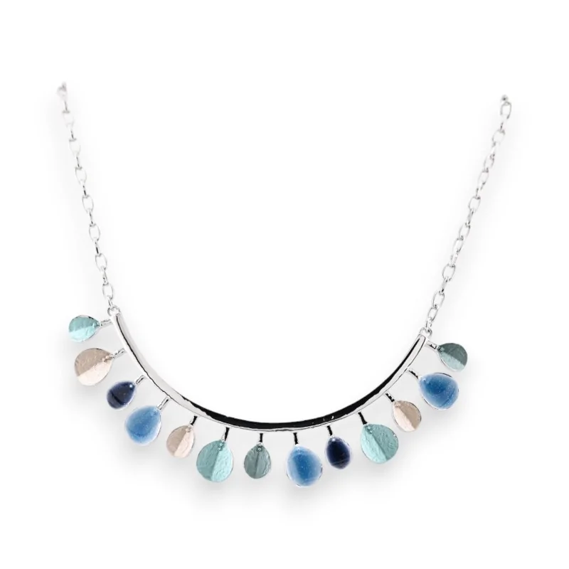 Ce collier fantaisie Ikita en métal argenté séduit par son design à la fois élégant et contemporain. Sa chaîne fine et brillante de 19 cm, prolongée d'une rallonge pratique de 5 cm, s'orne d'une succession de pampilles aux tons bleutés créant un effet de mouvement délicat. Les nuances de bleu ciel, turquoise et marine apportent une touche de fraîcheur et de légèreté à ce bijou raffiné. Avec son style épuré et féminin, ce collier saura sublimer aussi bien vos tenues de tous les jours que vos looks plus habillés.