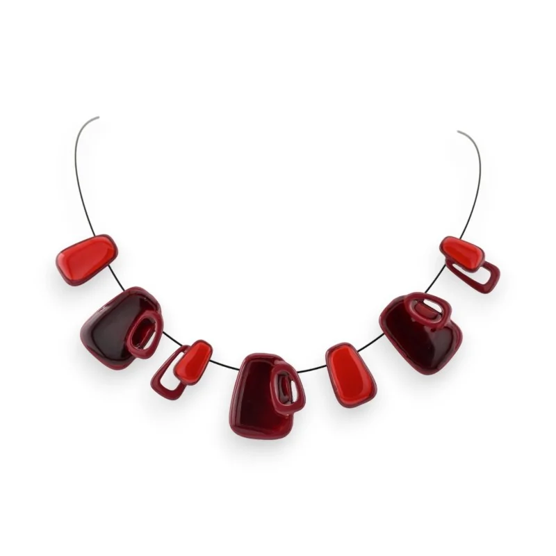 Que ce soit pour le bureau, une sortie entre amis ou une occasion plus formelle, ce collier saura mettre en valeur votre style personnel avec caractère. Les teintes rouge et bordeaux s'harmonisent particulièrement bien avec les tons neutres comme le noir, le blanc ou le gris, mais n'hésitez pas à oser des associations plus audacieuses !