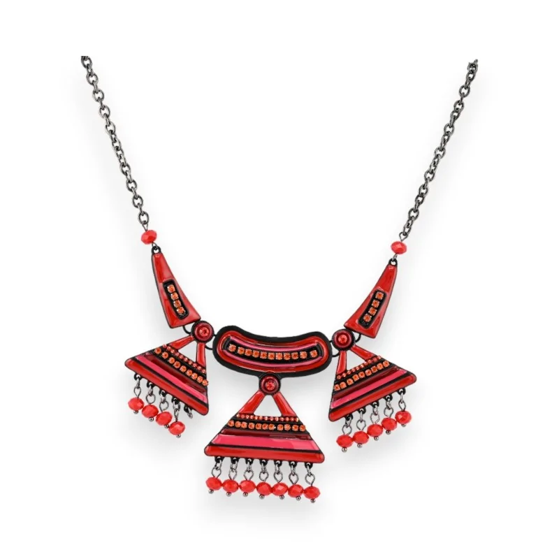 Laissez-vous séduire par le charme bohème de ce magnifique collier fantaisie signé Ikita. Son style ethnique unique en fait un véritable bijou statement qui ne passera pas inaperçu. Le médaillon central aux formes géométriques évoque l'artisanat tribal, tandis que ses nuances de rouge flamboyantes apportent une touche de passion à votre look. La chaîne en métal gris foncé contraste élégamment avec les tons chauds du pendentif, pour un rendu harmonieux et sophistiqué. Ajustable grâce à sa chaîne de rallonge de 7 cm, ce collier s'adaptera parfaitement à votre morphologie pour sublimer votre décolleté.