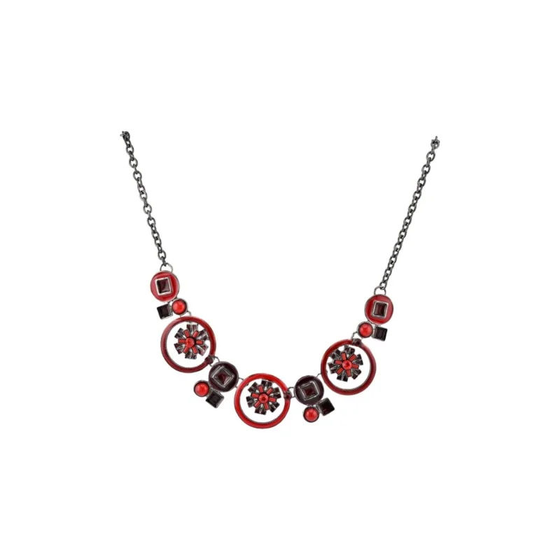 Le point fort de ce collier réside dans ses médaillons design aux formes géométriques variées. Ces éléments décoratifs apportent du relief et du caractère au bijou, créant un jeu de volumes captivant. Les tons rouges vifs contrastent élégamment avec le métal gris foncé, pour un rendu sophistiqué qui ne passera pas inaperçu.